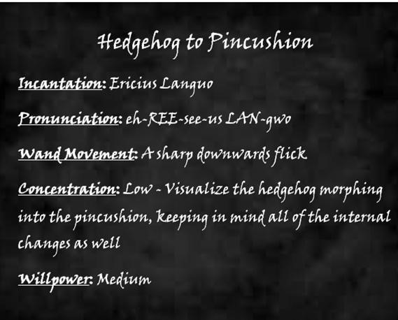 This is especially concerning considering the nature of our resulting object. If there is even a little bit of consciousness still present when one goes to use the transformed pincushion, the hedgehog will be able to feel the little prick and poke of every pin inserted. This pulls back in our ethics discussion. Before sticking any pins into your pincushion, you should be sure that the consciousness is completely muffled. Now, there is no way to determine this for certain, but you will normally be able to tell based upon how comfortable you are with the spell and how much you can feel the hedgehog’s will pushing back against your own when you cast it.